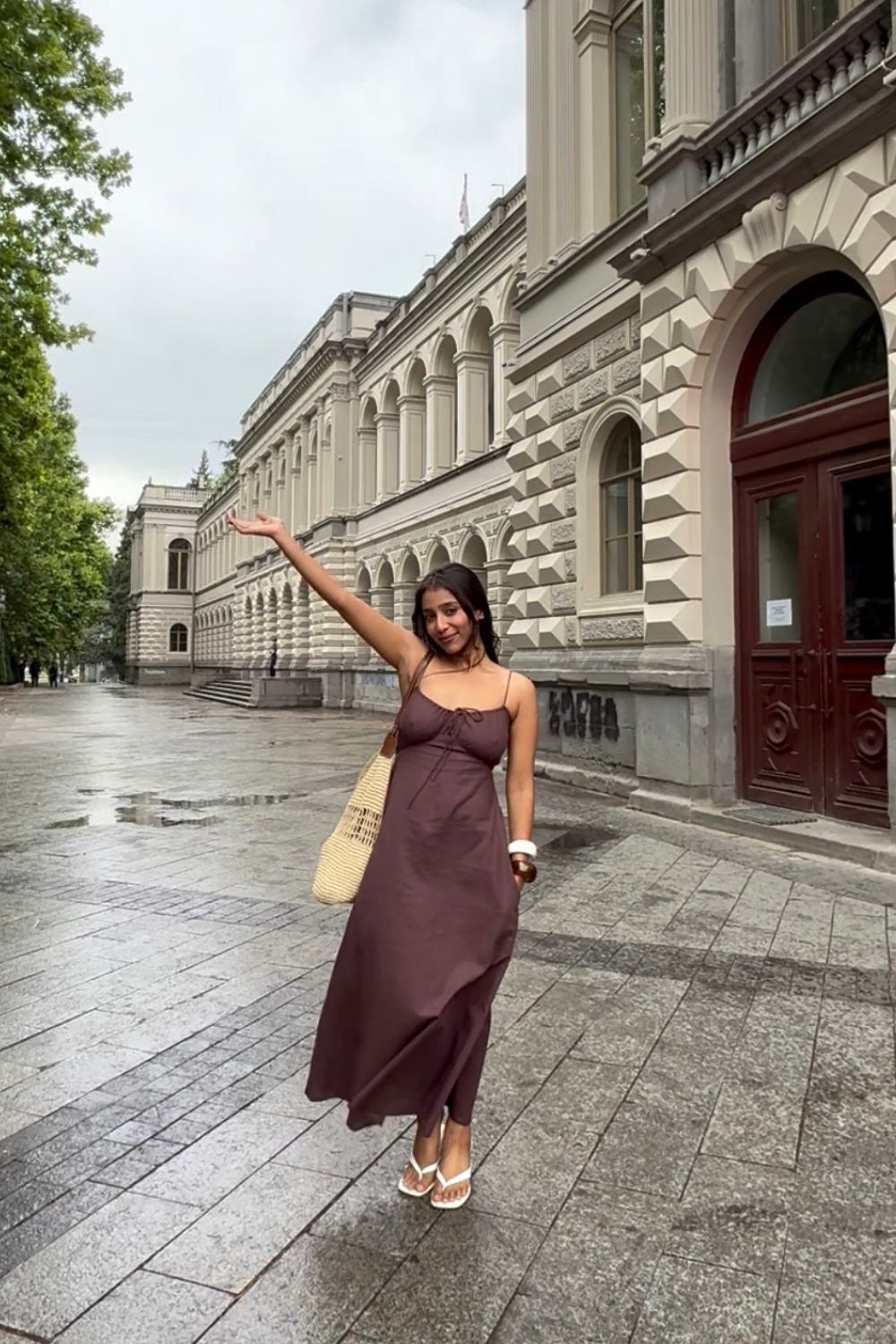 This isn’t just a dress—it’s a warm, chocolatey dream spun into an A-line silhouette. The Brownie Pie Dress is designed to turn heads and hold attention. With a deep round neckline in the front, a clean square back, and adjustable crisscross back ties, it flatters every curve while letting you move freely and feel completely you.