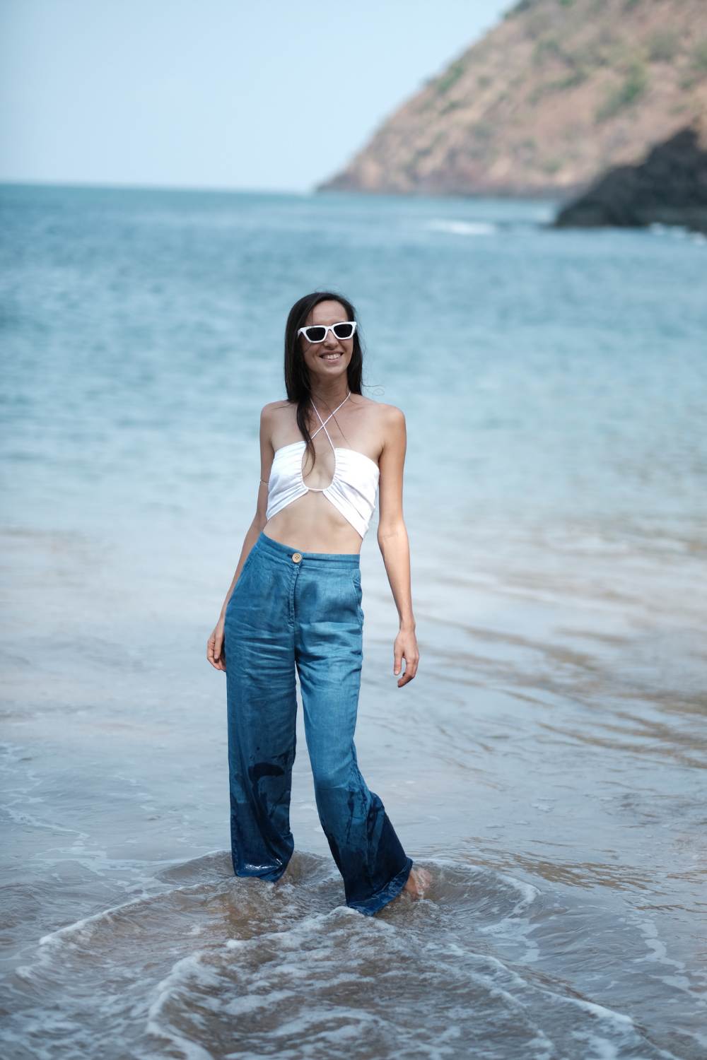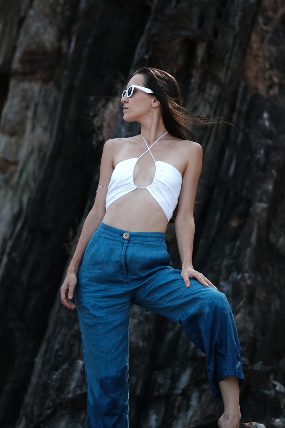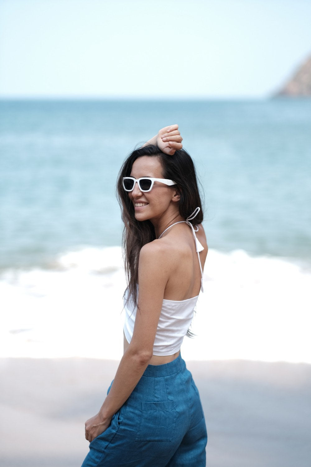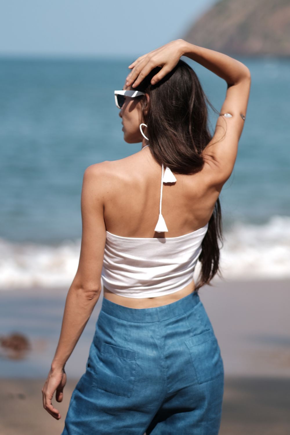 The white halter neck crop top in crisp white features a flattering halter neck, offering a cool and comfortable fit for summer.