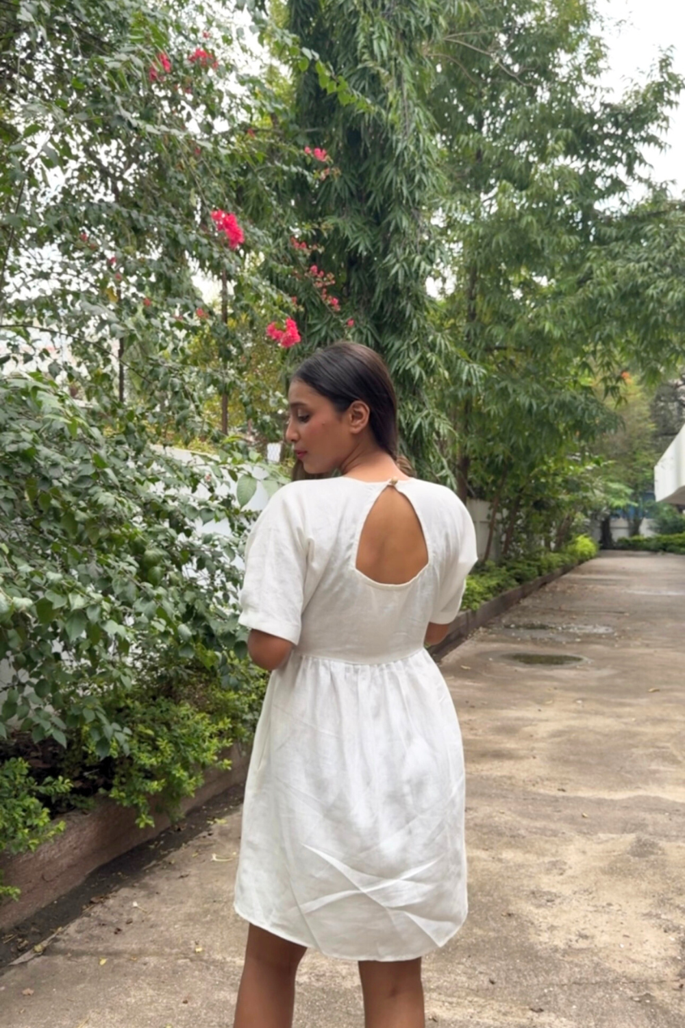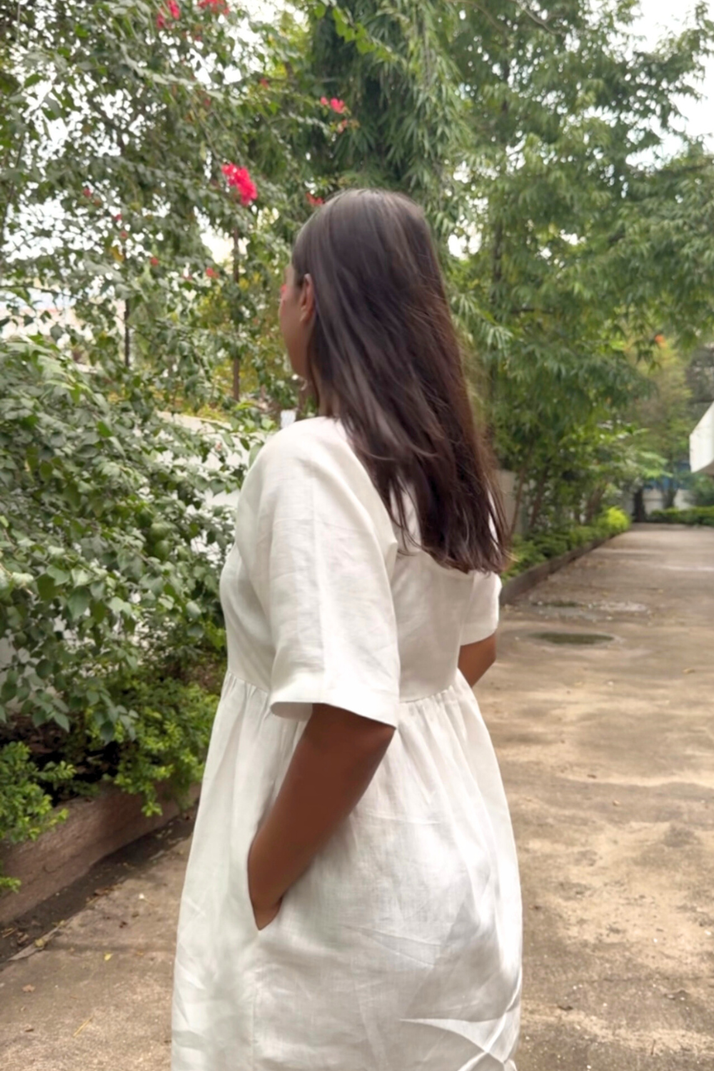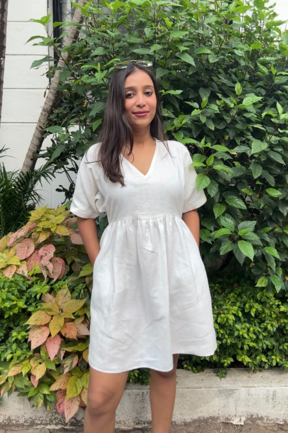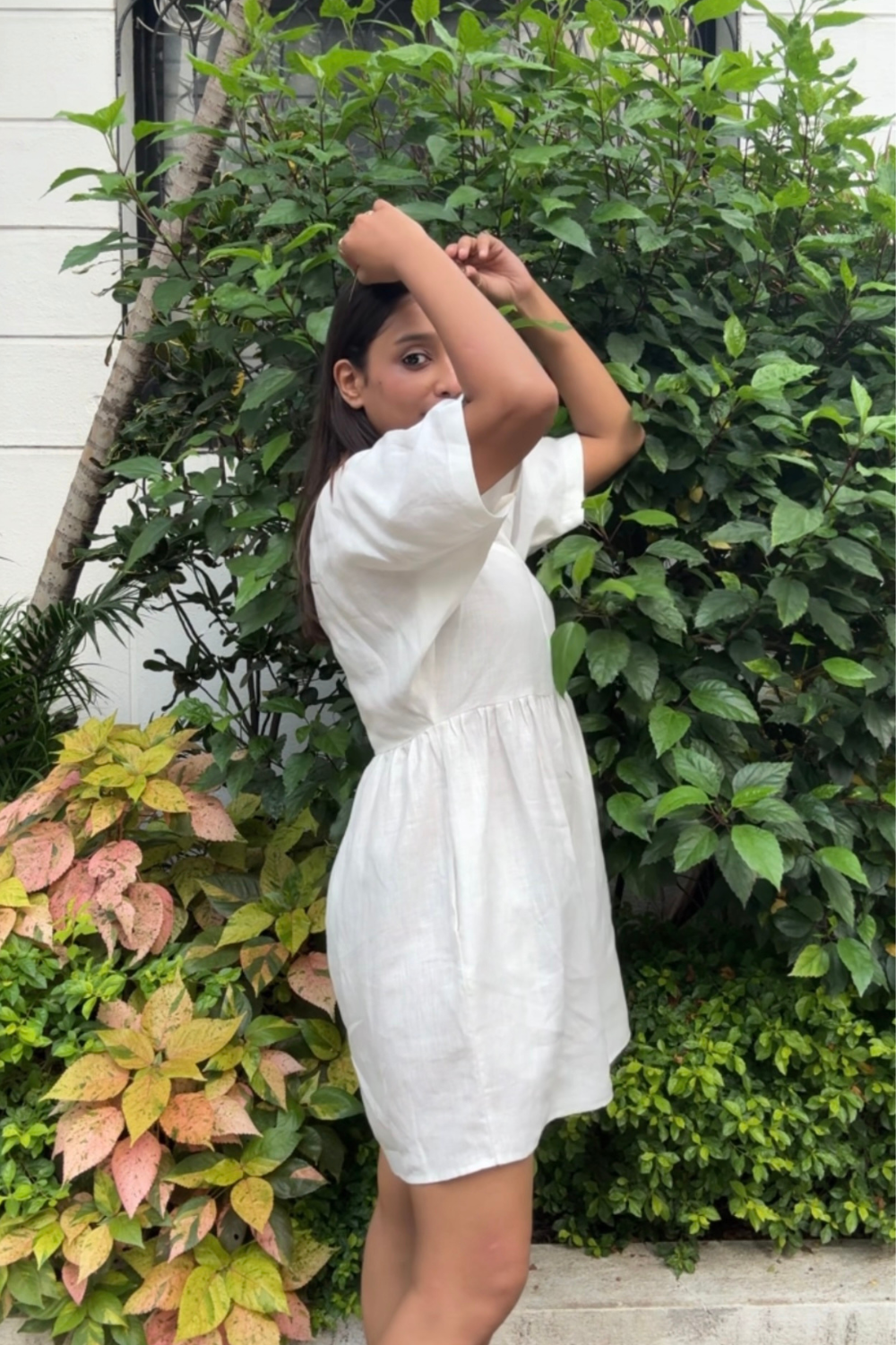 Dive into a world of effortless elegance with our White Smurf Mini Dress. Crafted from breathable, organic hemp, this dress is a love letter to sustainable style. The flattering V-neckline and short sleeves create a timeless silhouette, while its comfortable fit keeps you feeling easy and breezy all day.